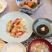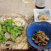 買い物だけで外出はしない日曜日の夕食です。夫と息子はビール、私はシャブリを開け母の日に乾杯。ハマコさんから頂いたひじきでひじきと新玉葱と胡瓜をフレンチドレッシングで和えたサラダこちらもハマコさんからの生しらす生姜醤油で頂きます。茄子、パプリカ、シメジ、オ ...