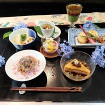 夏越月のお稽古に伺いました。先付水無月豆腐 雲丹仕立て煮物翡翠茄子と新蓮根の梅煮小鉢苦瓜とセロリのそぼろ炒め揚げ物穴子の東寺揚げ酢の物瓜とトマトの麹酢ご飯鯵茶漬けお出汁をかけて頂きます。飲み物は苺ハーブ水水菓子萌黄寒天水無月のお手本です。蒸し暑い季節に頂 ...