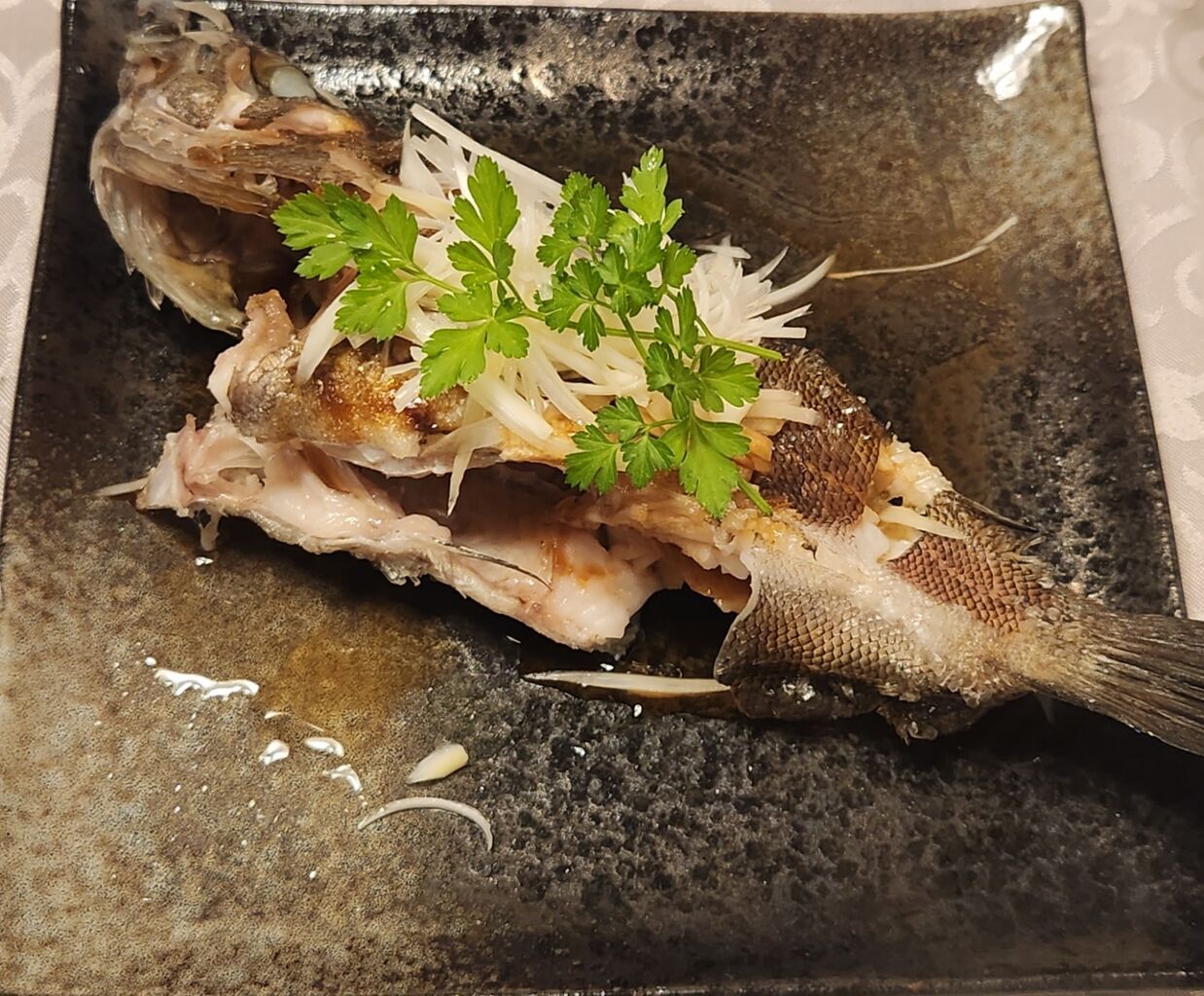 紹興酒を振りかけ5分レンチンしたメバルを醤油、オイスターソース、お酢のタレを掛けて