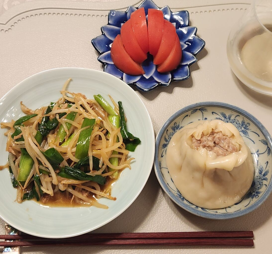 トマト、ジャンボ焼売、豚肉もやしニラ炒め