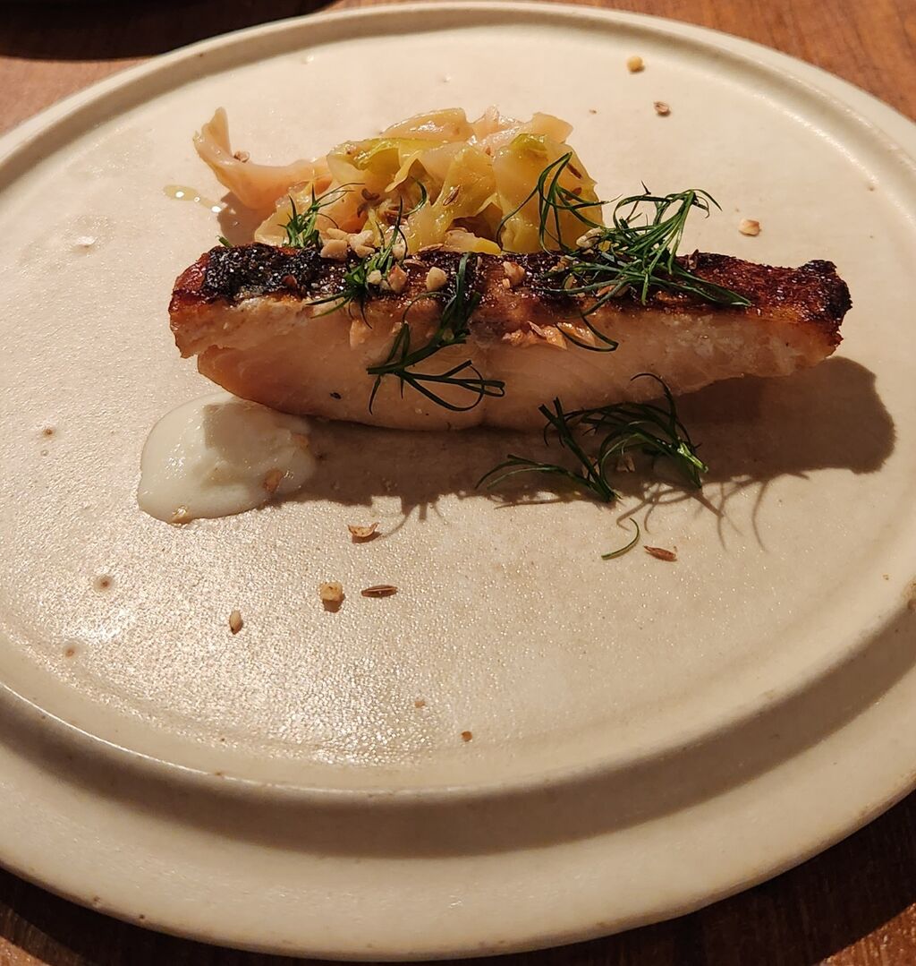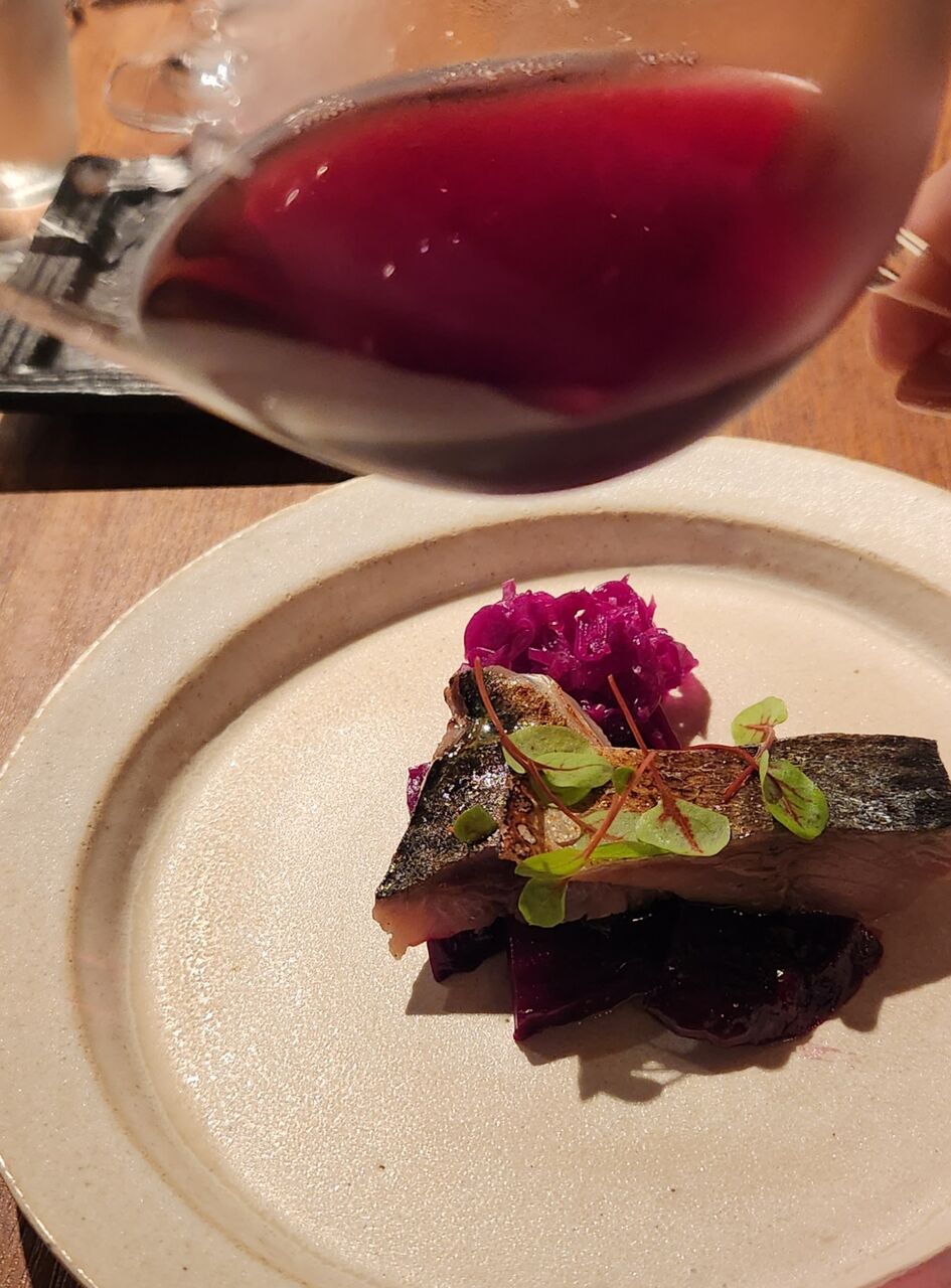 3皿目は鯖のソテーにビーツと紫キャベツのラペ