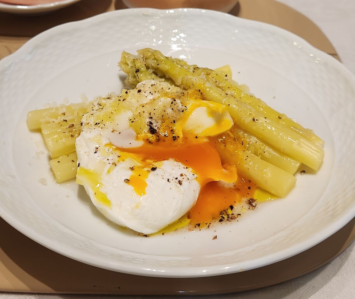 ポーチドエッグとパルミジャーノチーズ、ブラックペッパーで頂くことにします。