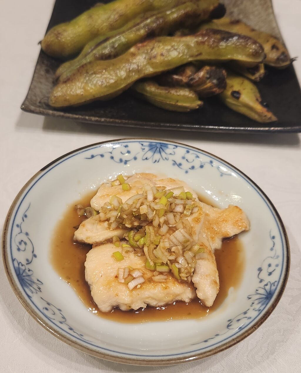 長葱、柚子胡椒、ポン酢のタレをかけて頂きます。