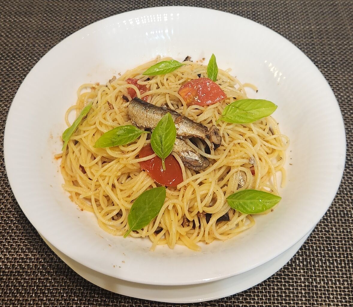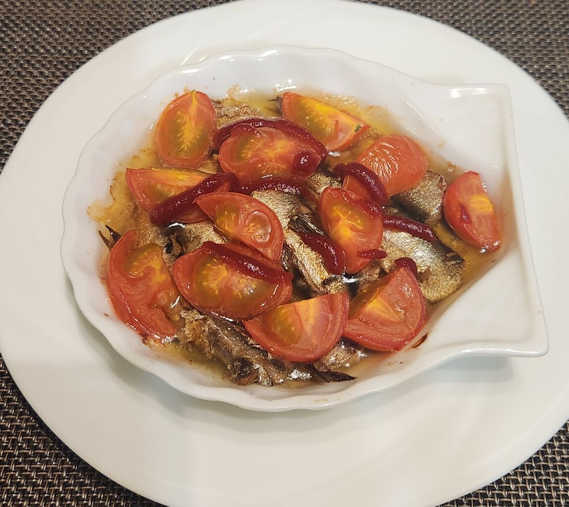 オイルサーディンの缶詰が賞味期限を過ぎていたのでチュウブの大蒜、プチトマト、少しのケチャップを入れてオーブンで焼き