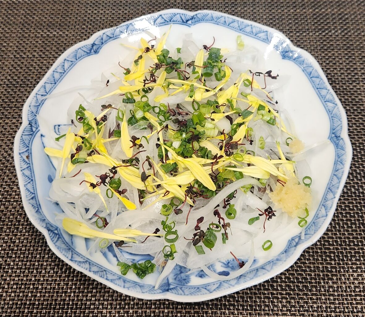 薄めにスライスして玉葱、菊花、紅タデ、小葱をトッピング
