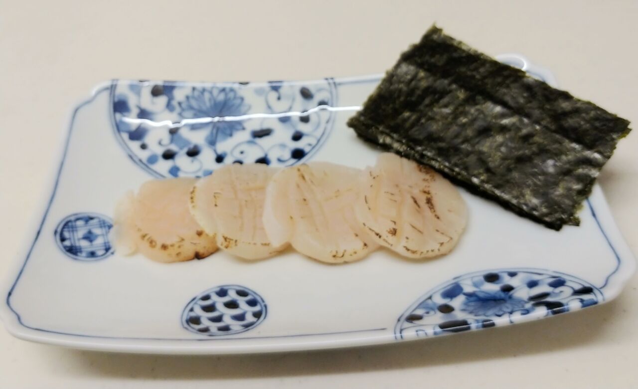息子の好きなホタテは表面を炙って海苔と山葵のお醤油で