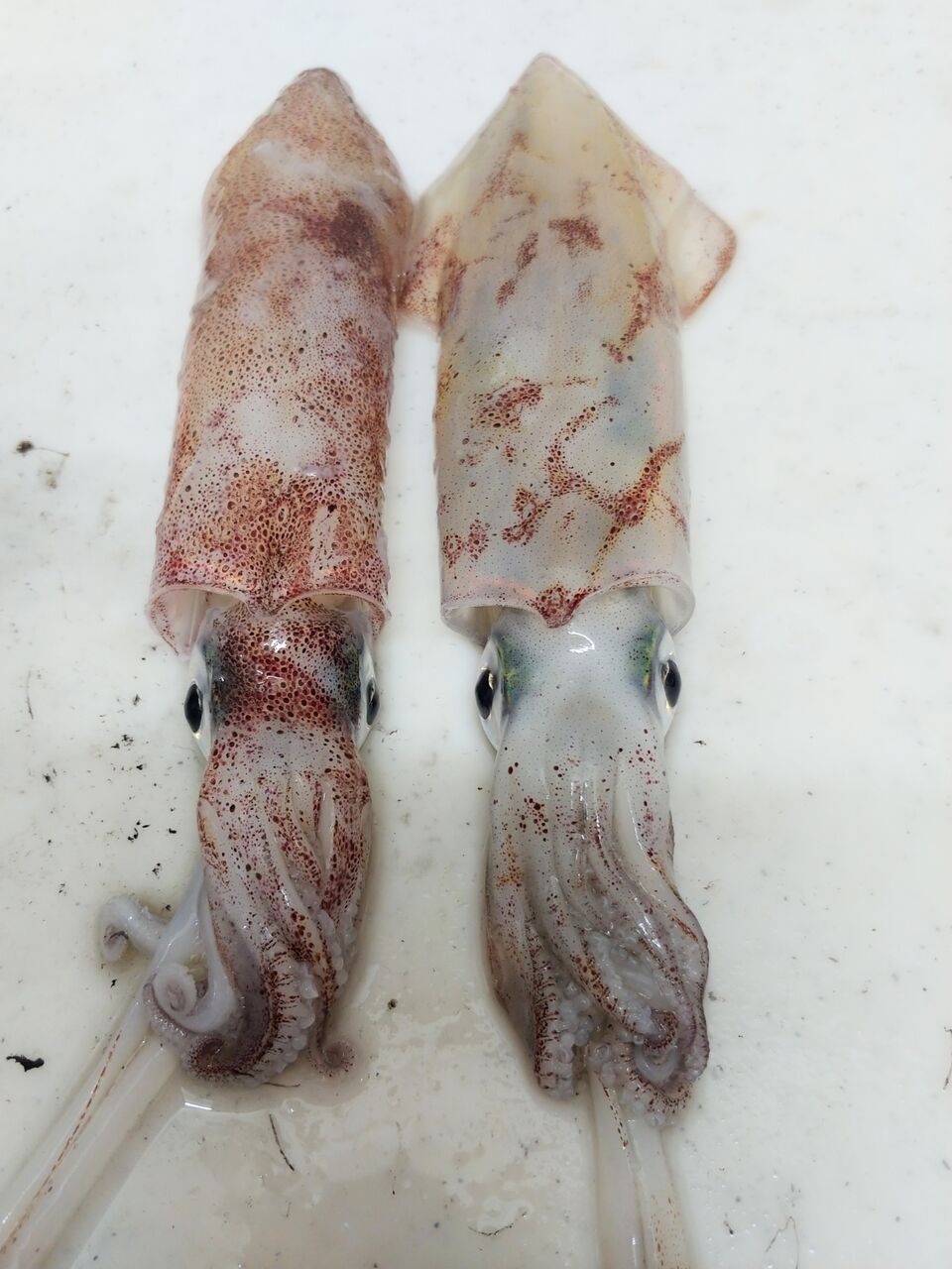 白い方が丸イカで褐色がかっているのがスルメイカです。