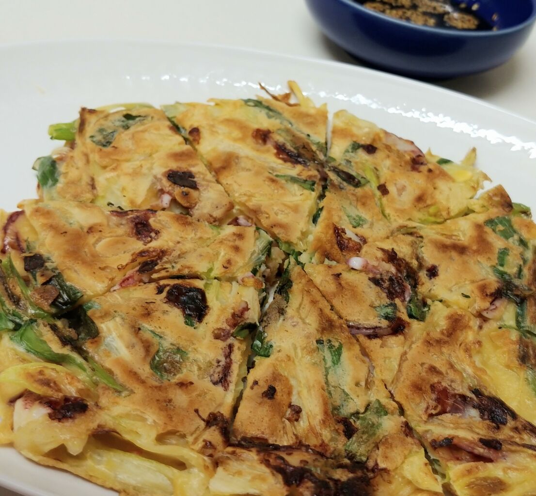 冷凍しておいた烏賊げそで、チヂミ