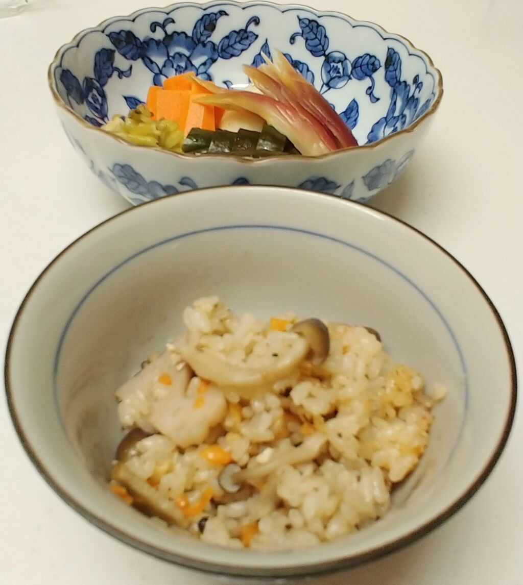 ごぼう、蓮根、人参、しめじ、油揚げの五目ご飯と糠漬け